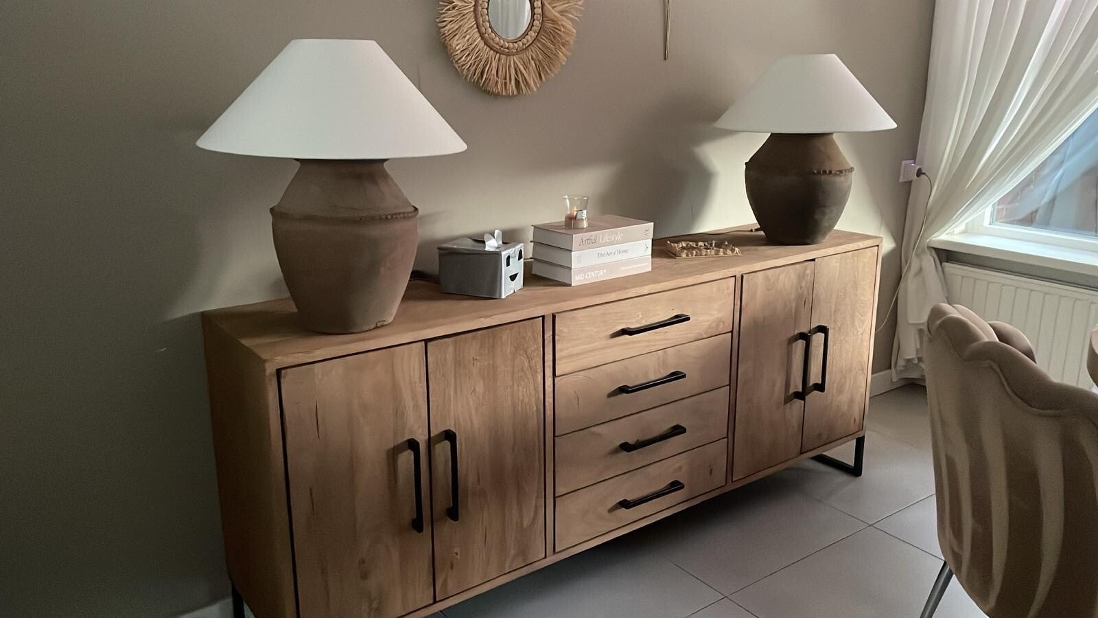 Keramieke lampvoet (±20 cm) met stijlvolle puntvormige lampenkap (Ø 50 cm) in Hopper Wit. Totale hoogte circa 50–60 cm. De lamp is naar wens leverbaar in diverse stoffen en kleuren. Omdat het een handgemaakt natuurproduct is, kunnen kleur en hoogte licht variëren. Bestel je meerdere lampen, dan selecteren wij zorgvuldig de mooiste, bijpassende combinatie.